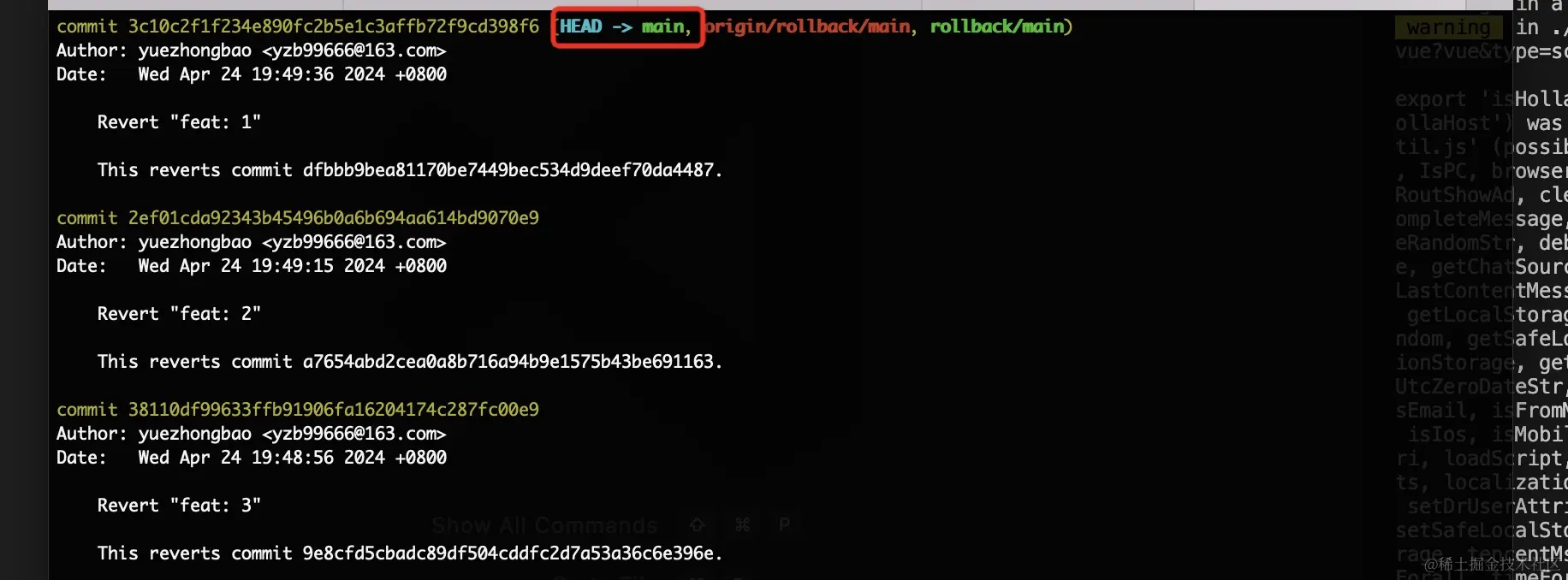 接下来检查本地main分支代码确实回归到之前你想要的版本了之后,执行