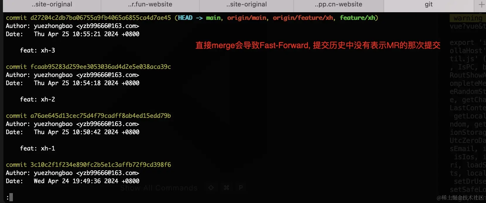 有可能会出现Fast-Forward合并的情况,就是没有MR合并,提交历史与feature/xh一致.