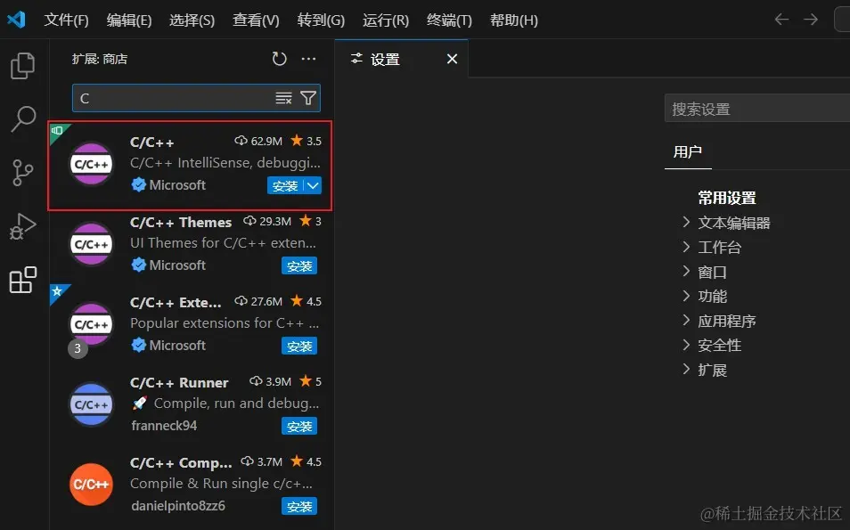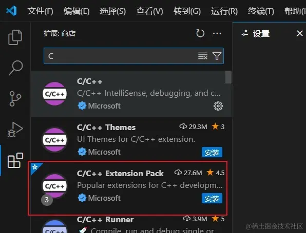 这个插件包含了 C/C++ 工程需要的插件(C/C++ Themes、CMake、CMake Tools等)