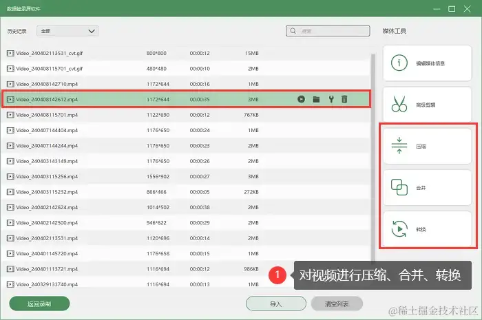 步骤4:在录制历史页面,我们可以快速找到录制过的直播视频,对它进行压缩、转换、合并等相关操作。