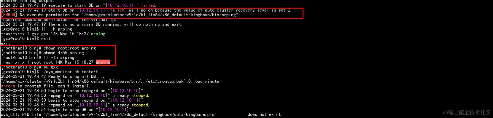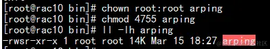 3. arping_path的可执行文件,该可执行文件对应的是集群启动中,vip切换时arp cache的清理和测试。该可执行文件有两个选择:OS自带的(/usr/sbin/arping);wc安装完成后kingbase/bin目录下的arping文件。由于KingbaseES或RWC软件安装使用的是数据库用户,而不是操作系统的root用户,但是集群启动时,需要root用户权限去执行部分操作。确保ng_path的可执行文件,权限是-rwsr-xr-x,且执行用户和属组均为root,效果如下图: