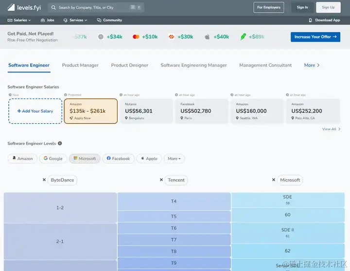 Levels.fyi是一个提供科技公司职位薪酬、职级、福利等信息的平台,旨在帮助求职者和在职员工更好地了解和比较不同公司的薪资水平和职业发展路径。Levels.fyi提供了大量科技公司的薪资和职级信息,这些数据是从真实的员工反馈中收集而来的,因此具有一定的可信度和参考性。