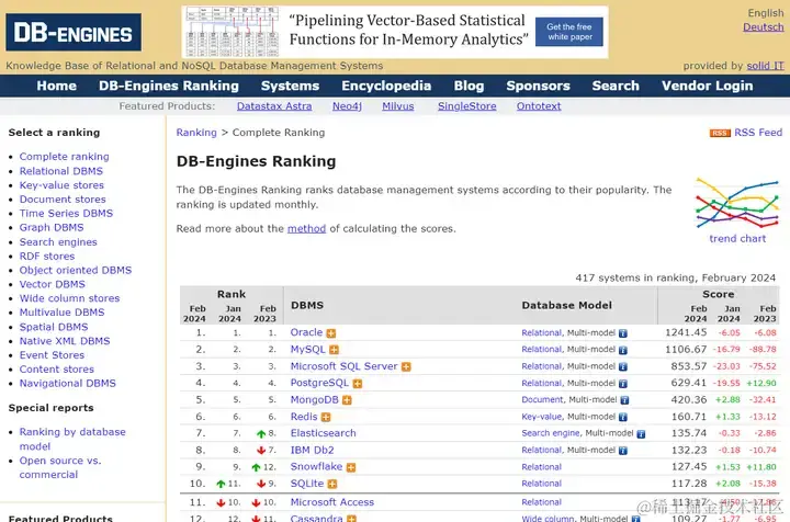 DB-Engines 涵盖了多种类型的数据库,包括关系型数据库、文档型数据库、图数据库等,为用户提供了一个全面了解不同类型数据库的平台。DB-Engines 提供了实时更新的数据库排名和趋势图表,让用户可以及时了解数据库的变化和发展趋势。