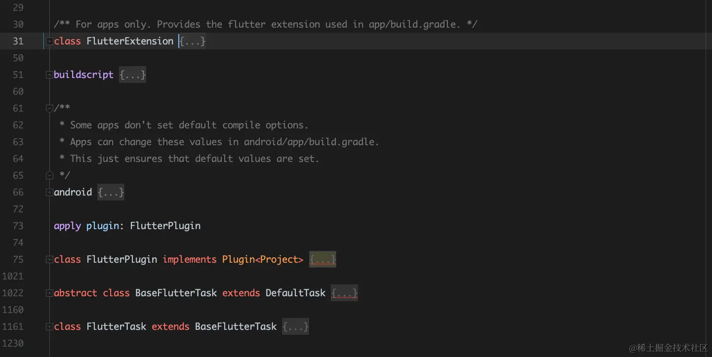 即向工程注册了一个FlutterExtensions扩展,并命名为flutter,这里的FlutterExtension,其实就是flutter.gradle开头声明的第一份部分,包括如下的内容: