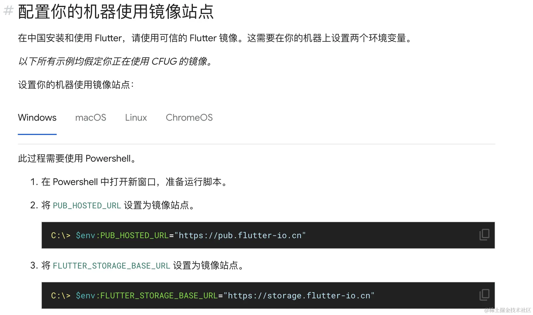 在flutter官方文档中,通常会建议我们将Flutter的镜像地址,替换为国内的镜像地址: