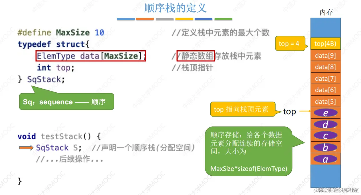 采用顺序存储的栈称为顺序栈,它利用一组地址连续的存储单元存放自栈底到栈顶的数据元素,同时附设一个指针(top)指示当前栈顶元素的位置。
