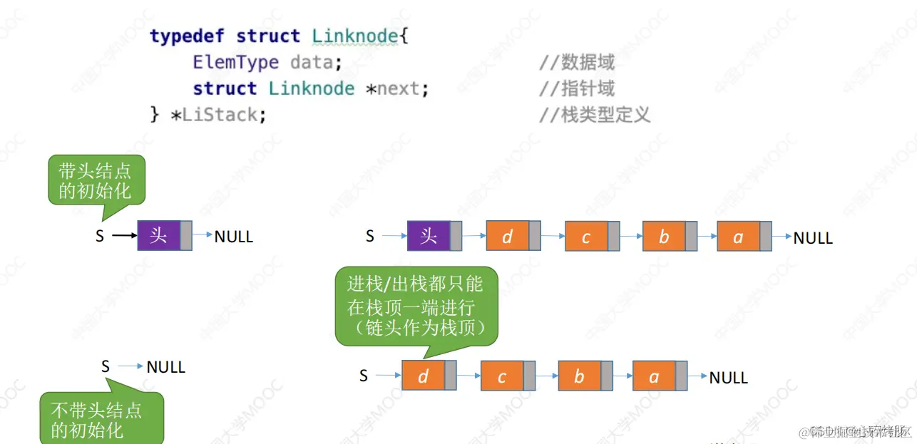 采用链式存储,便于结点的插入与删除。链栈的操作与链表类似,入栈和出栈的操作都在链表的表头进行。需要注意的是,对于带头结点和不带头结点的链栈,具体的实现会有所不同。