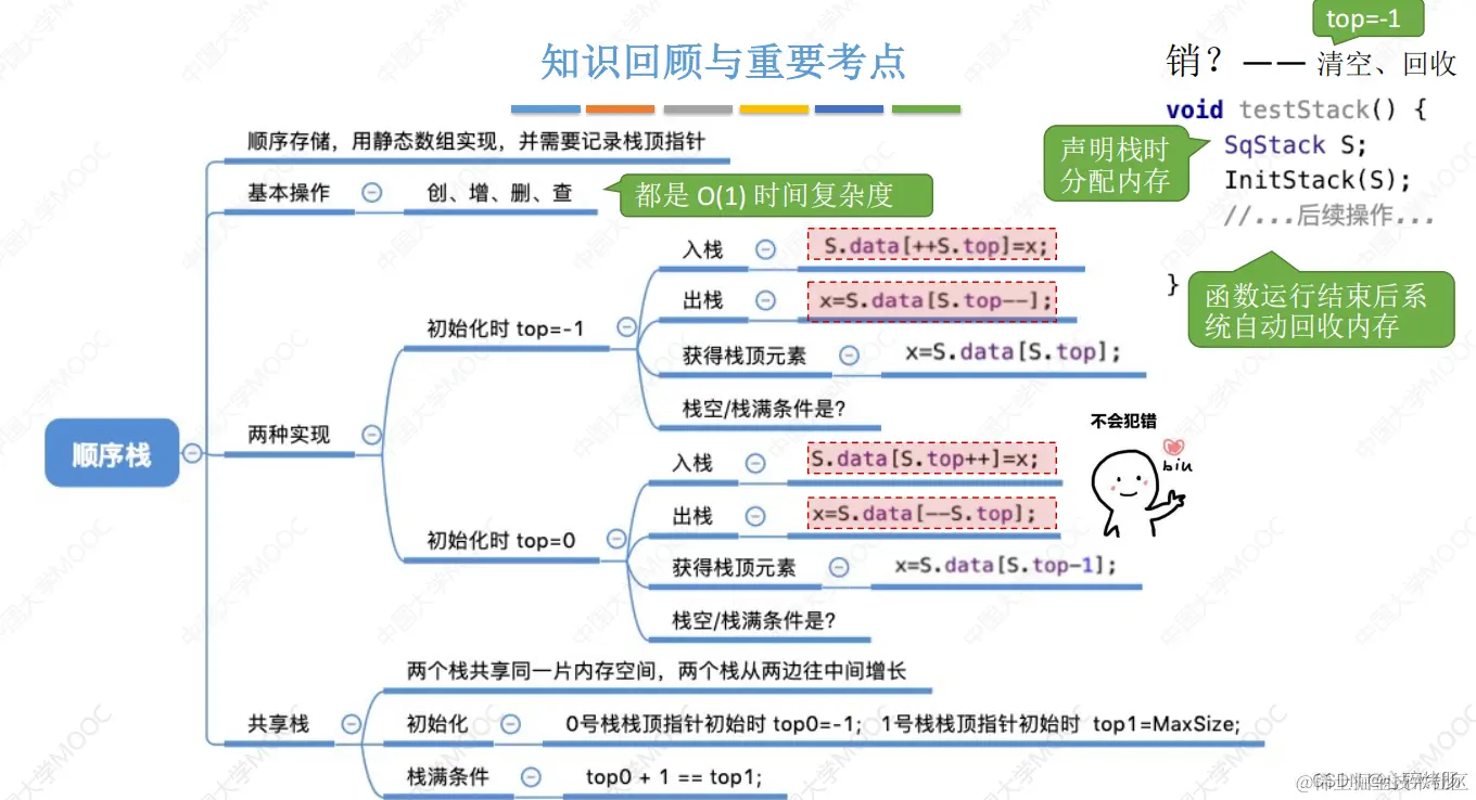 这里的 top 指的是栈顶元素。于是,进栈操作为 S.data[++S.top]=x,出栈操作为x=S.data[S.top--]。若栈顶指针初始化为S.top=0,即 top 指向栈顶元素的下一位置,则入栈操作变为S.data[S.top++]=x;出栈操作变为x=S.data[--S.top]。相应的栈空栈满条件也会发生变化。
