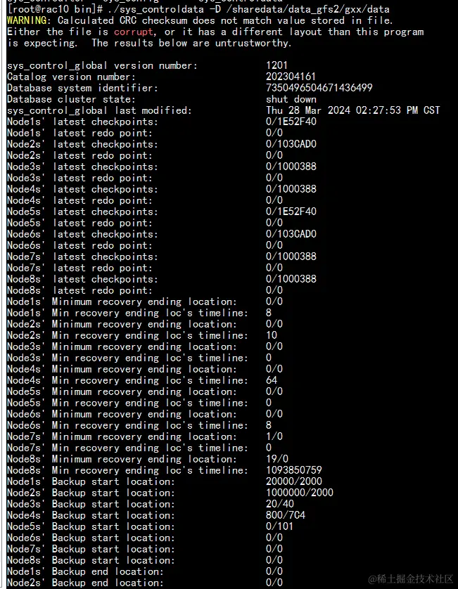 cd {版本1的rac集群二进制文件部署目录};./sys_controldata -D {基于gfs2部署的data目录} >a.text