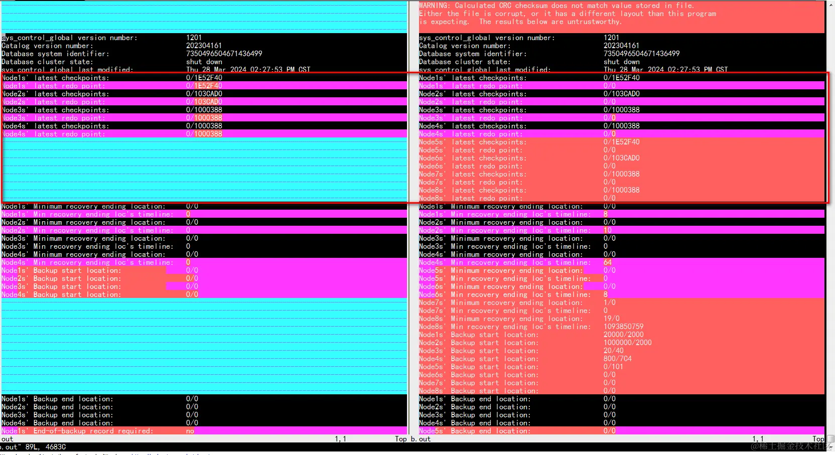 cd {版本2的rac集群二进制文件部署目录};./sys_controldata -D {基于gfs2部署的data目录} >b.text