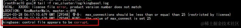- 查看具体节点的kingbase1.log日志,提示控制文件被破坏