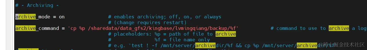 2.修改kingbase.conf配置文件, archive_command = 'cp %p 你自己建的文件夹路径/%f