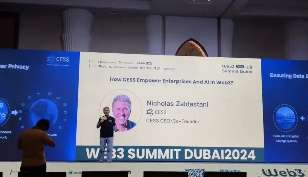 在迪拜举办的 Web3 峰会上,CESS 团队作为赞助商和出展商,向与会者展示了在去中心化存储和 CDN 技术上的最新突破。这个峰会是一个汇聚 Web3 行业专家、投资者、开发者和技术的盛会,涵盖了区块链、去中心化技术、人工智能和其他相关领域。在这个峰会上,CESS 展位成为了关注的焦点之一,吸引了许多与会者前来参观,了解他们在 DePIN(去中心化物理基础设施网络)领域的创新解决方案。通过与参观者的交流,我们分享了在区块链驱动的去中心化存储和 CDN 网络之上建设数据价值网络的愿景,展示了如何为 Web3 生态系统提供强大的基础设施支持。参与者对 CESS 团队的技术能力和创新精神表示了极大的兴趣,并进行了深入讨论,探讨如何在未来合作与交互。