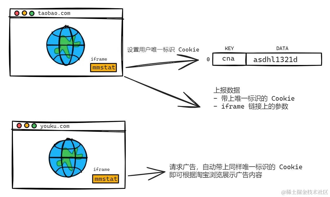 - 用户打开优酷,优酷使用 mmstat 的页面加载广告,这时打开的页面是在 mmstat 域名下的,所以请求广告时会自动带上 mmstat 域名下的 Cookie,包括了上边设置的 uid,接下来就可以根据之前记录的 uid 与浏览内容的关联关系返回相应的广告。
