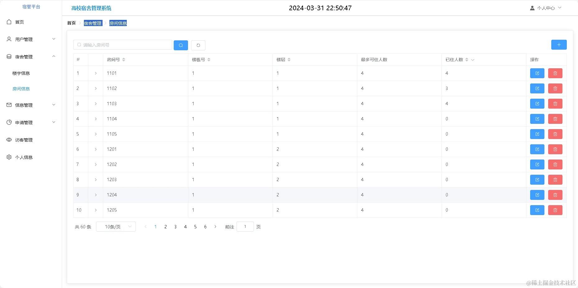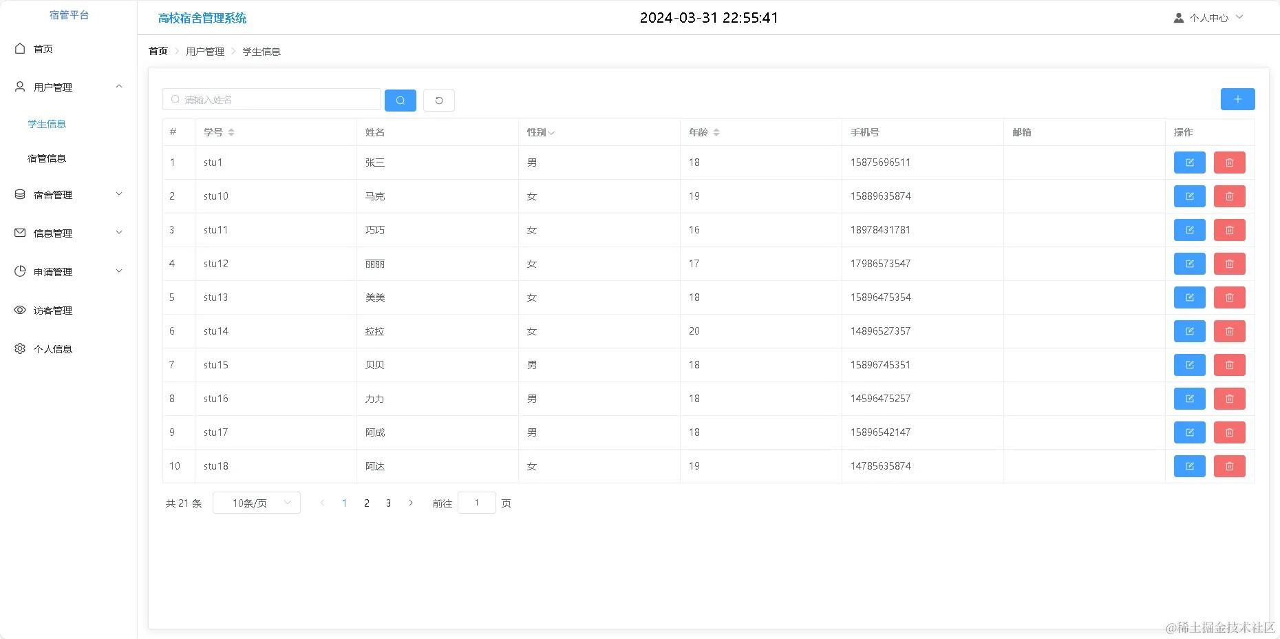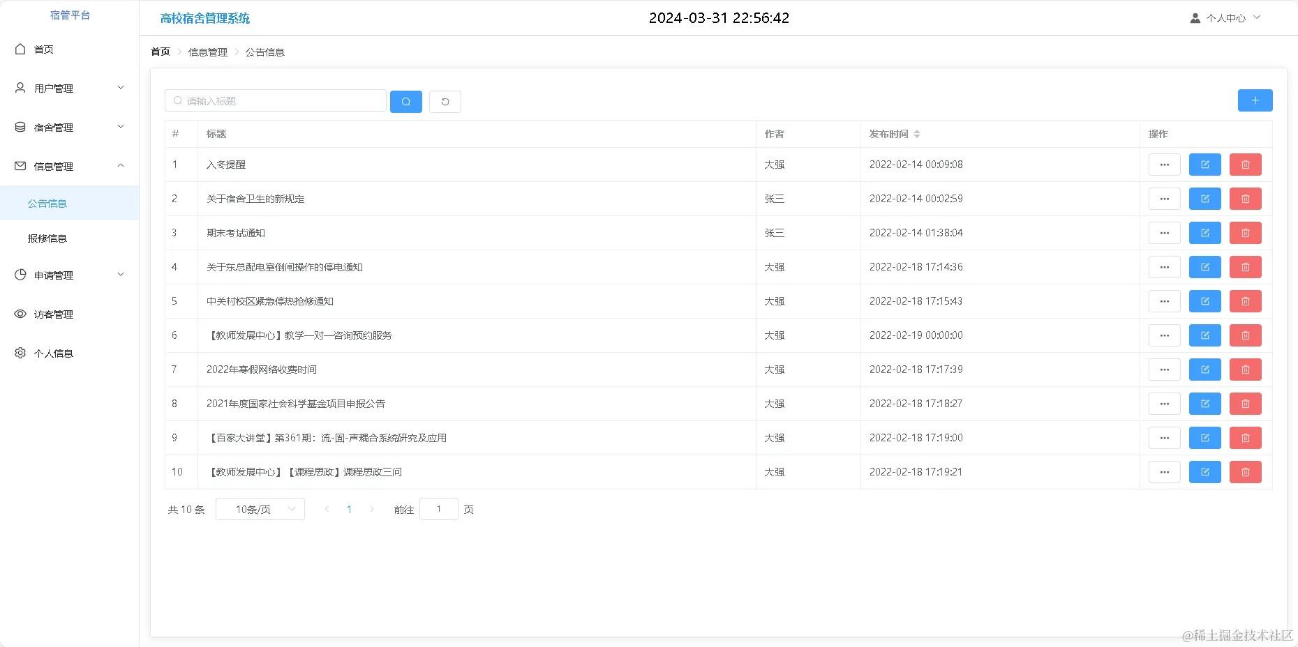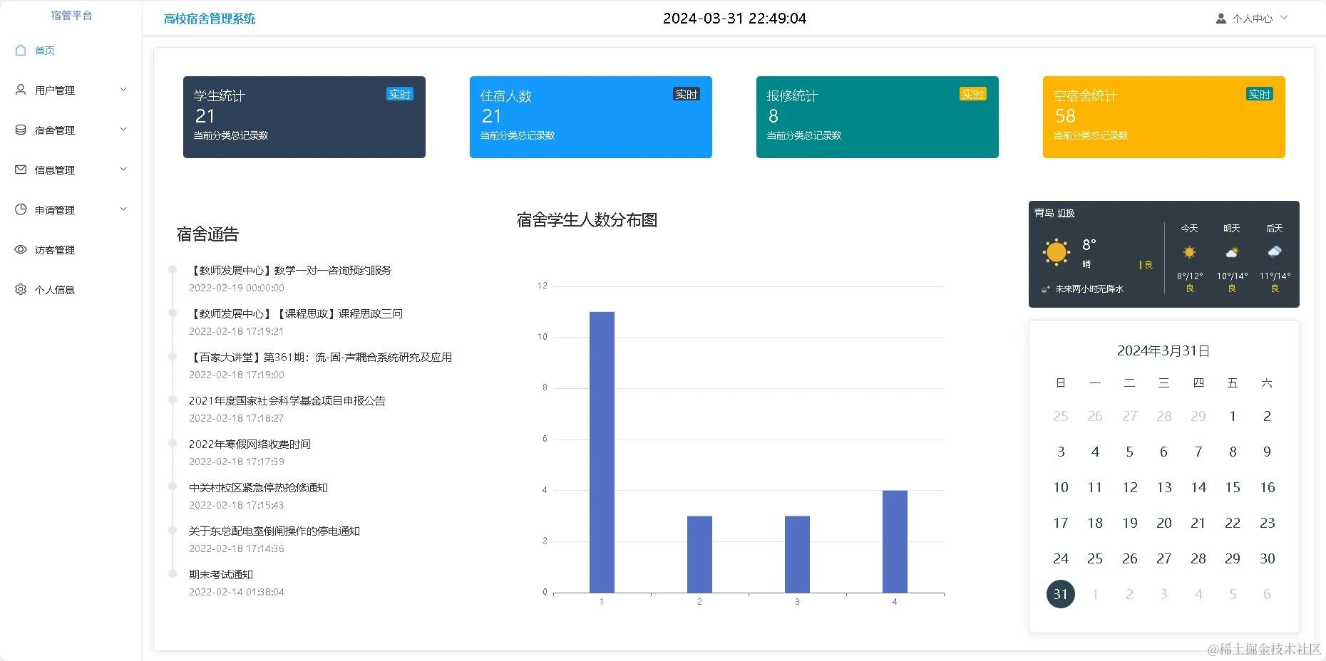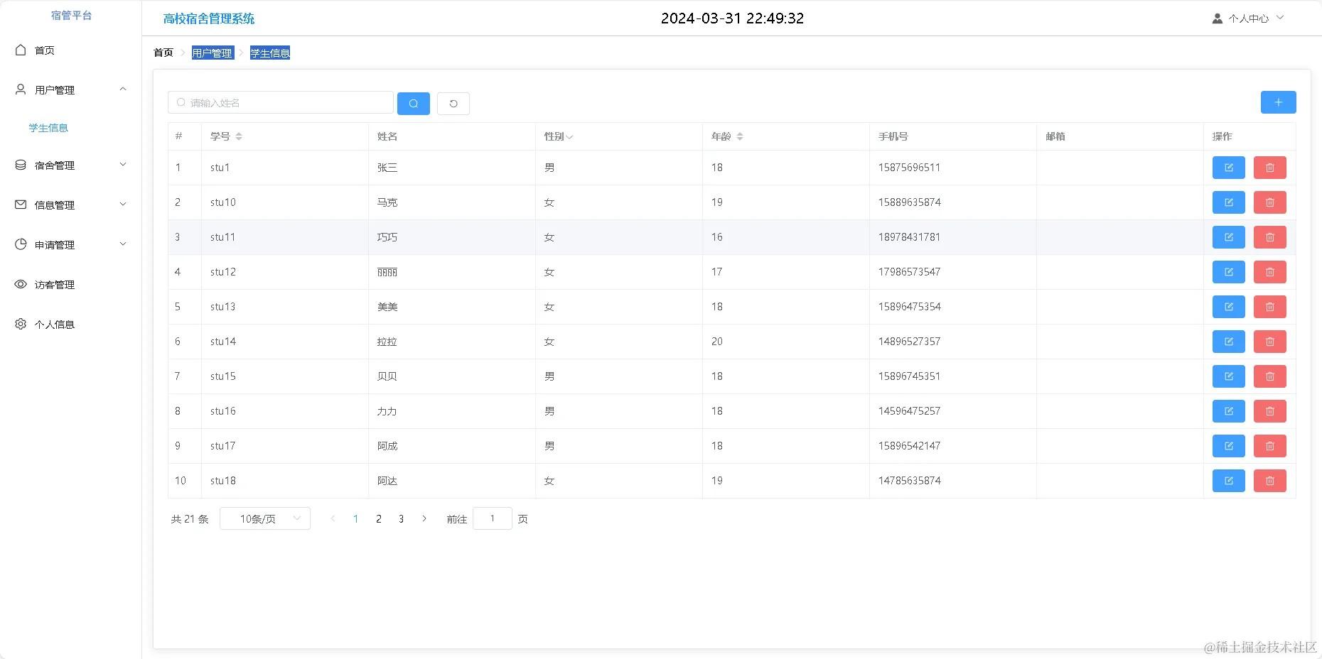 高校宿舍管理系统主要包含学生端、宿管端、管理员端三个板块。