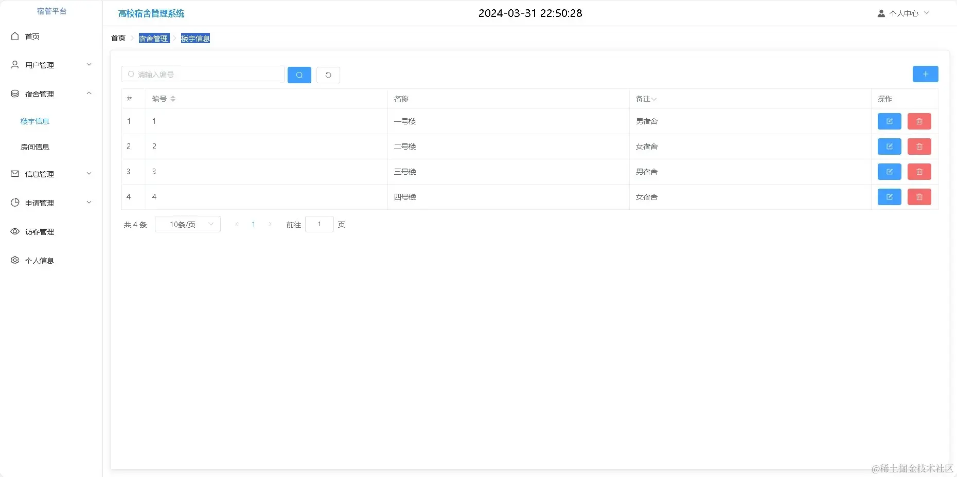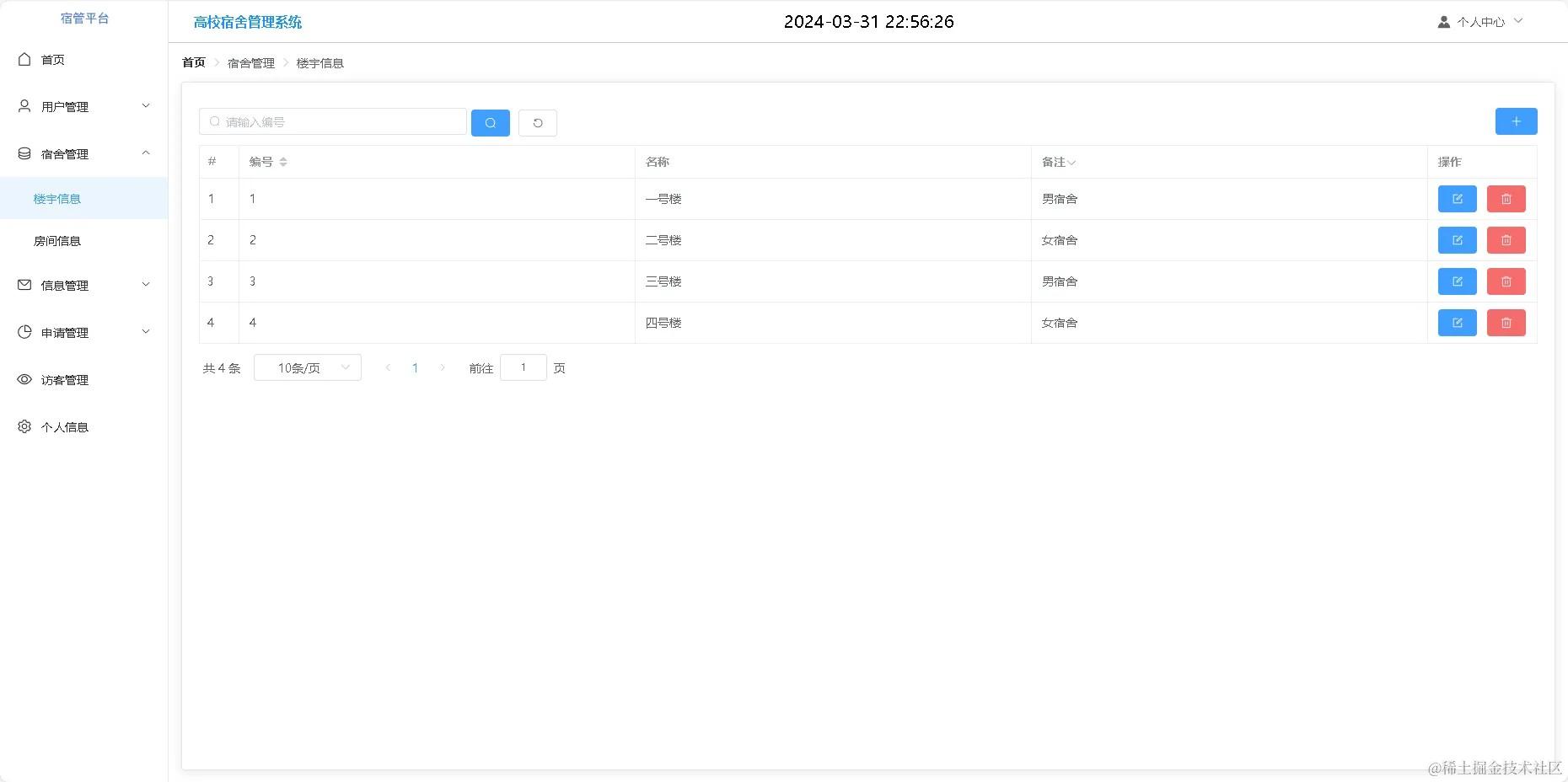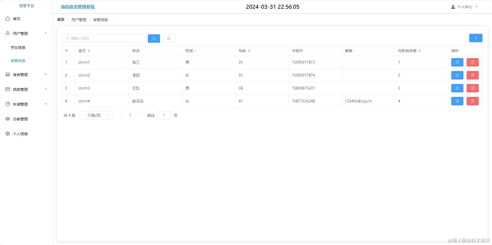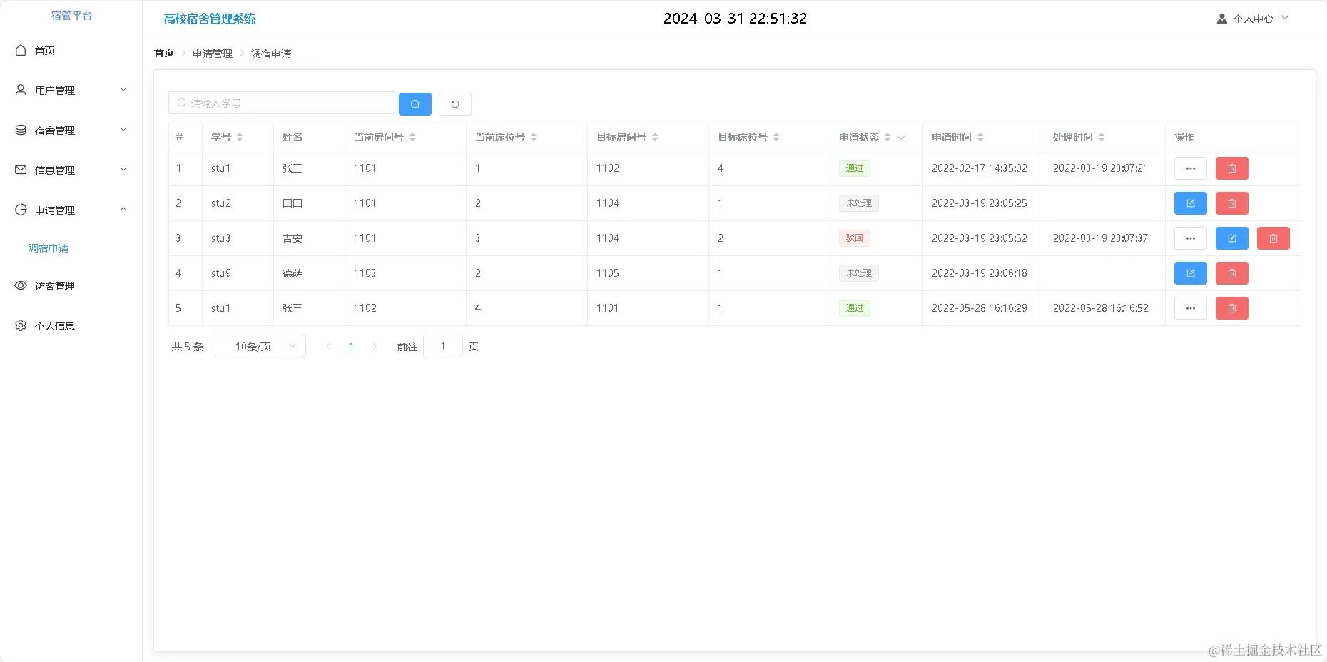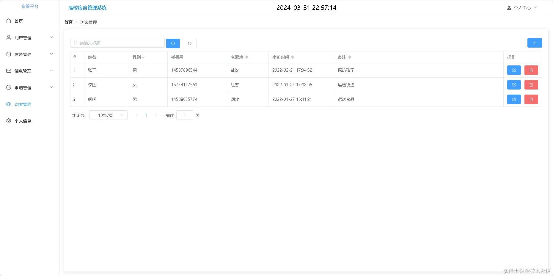 高校宿舍管理系统主要包含学生端、宿管端、管理员端三个板块。