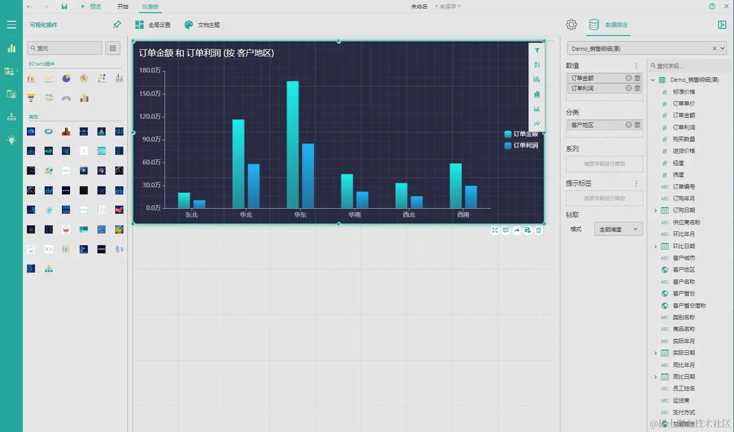 (1)首先打开设计器,选择柱形图(Echarts),绑定数据分类和数值。