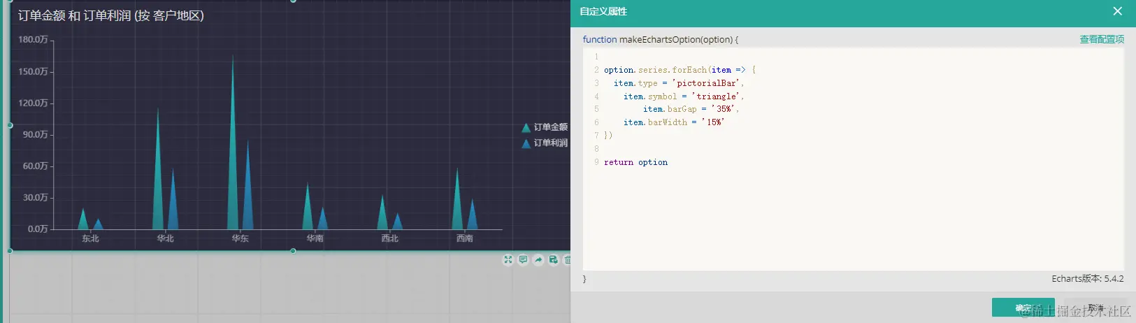 (2)打开设计器中的组件自定义属性,通过前端的JS代码编写的方式修改柱形图的形状,前端代码如下: