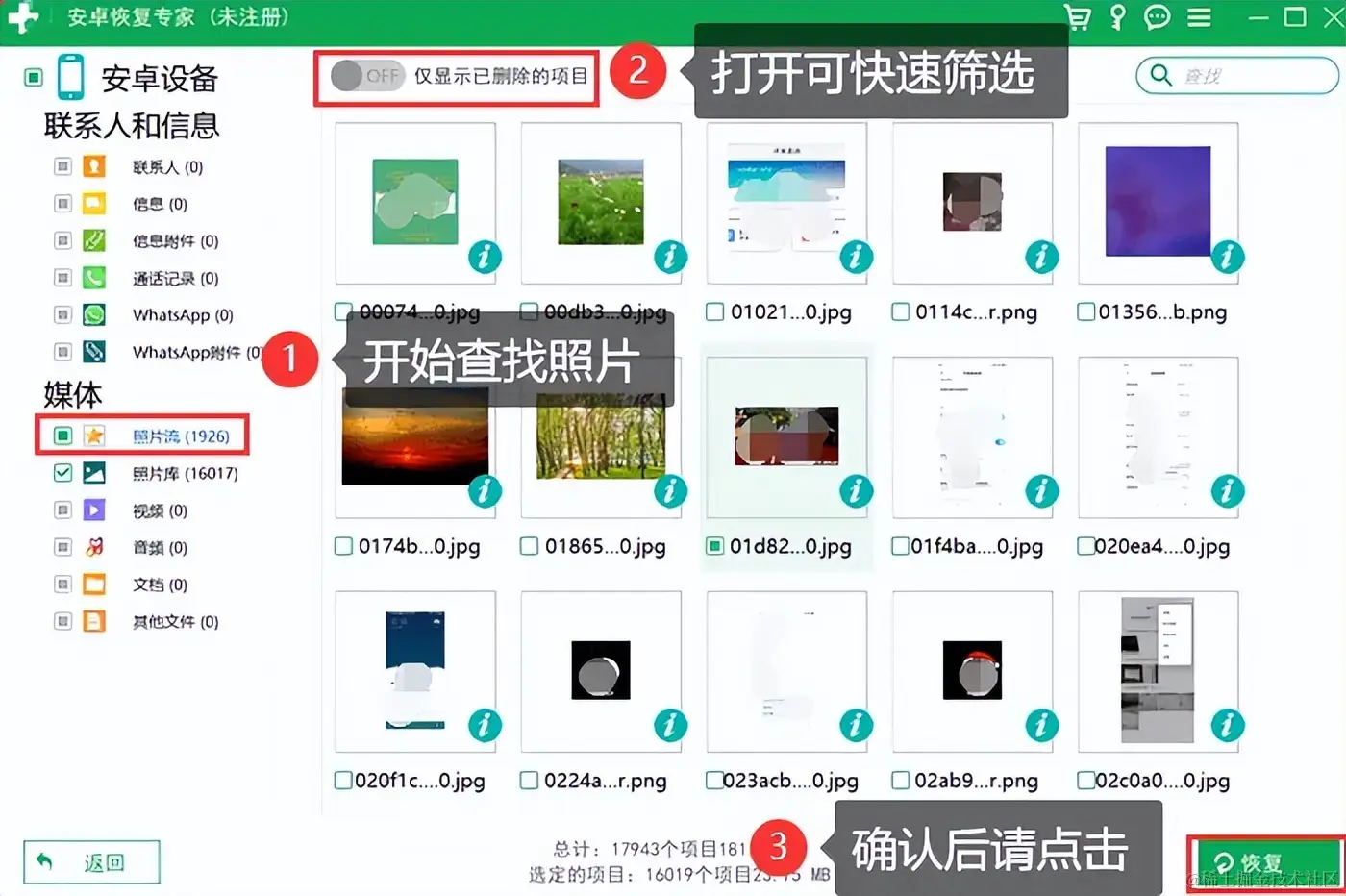 步骤3:扫描完毕后,可在页面左框勾选 【照片流】 ,然后再将 【仅显示已删除的项目】 开关打开,有助于快速找到照片。找到后勾选照片,然后点击恢复即可。