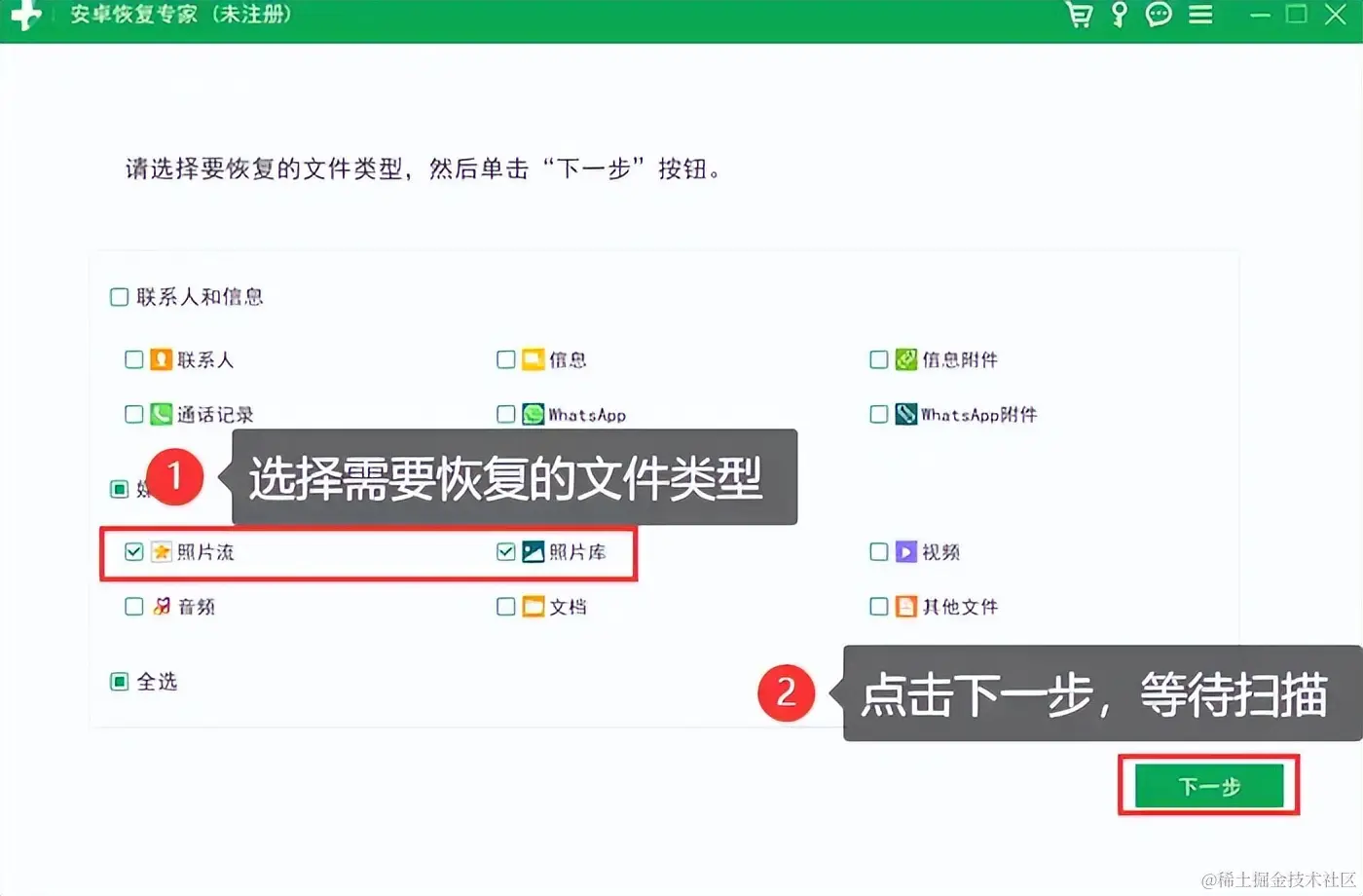 步骤2:选择需要恢复的 【文件类型】 ,然后点击右下方的 【下一步】 ,使软件对手机数据进行扫描。数据量大则扫描等待的时间会长一些。