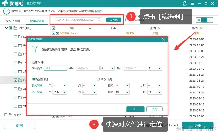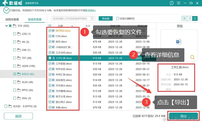 第3步:在扫描完成后,可以根据实际的恢复需求,查看并勾选扫描到的数据,根据文件的名称、大小和日期可确定需要恢复的文件;