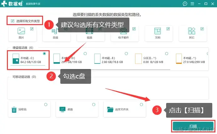 第2步:进入软件的主界面后,根据实际需要,建议勾选所有文件类型,并勾选上 【本地磁盘:C】,单击【扫描】 ;