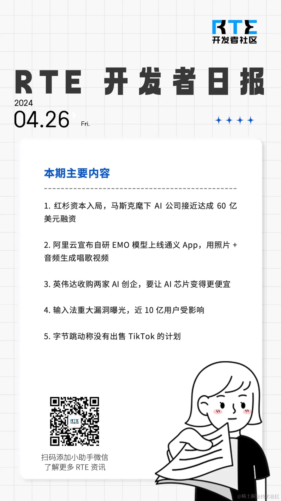 我们欢迎更多的小伙伴参与「RTE 开发者日报」内容的共创,感兴趣的朋友请通过开发者社区或公众号留言联系,记得报暗号「共创」。