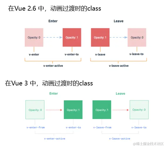 解决方案:在全局的动画类名文件中,同时补齐2个框架下的类名,让动画类同时支持Vue2 和 Vue3的Transition组件