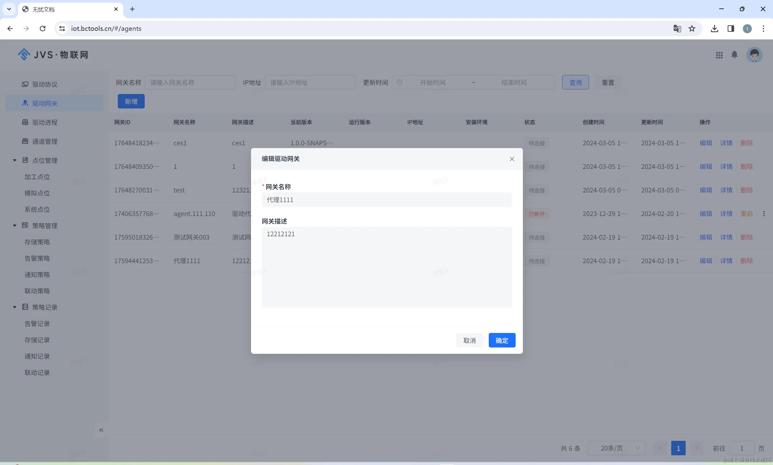 **驱动网关的编辑:**可以修改驱动网关与描述,如下图所示