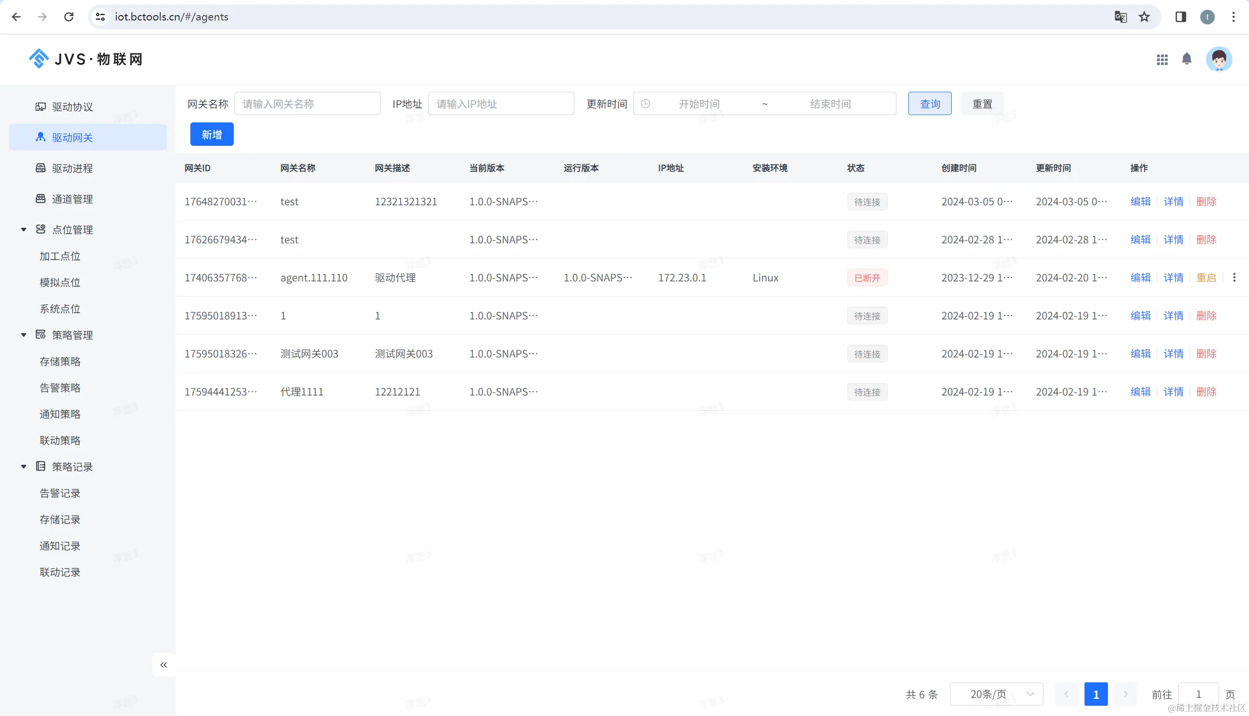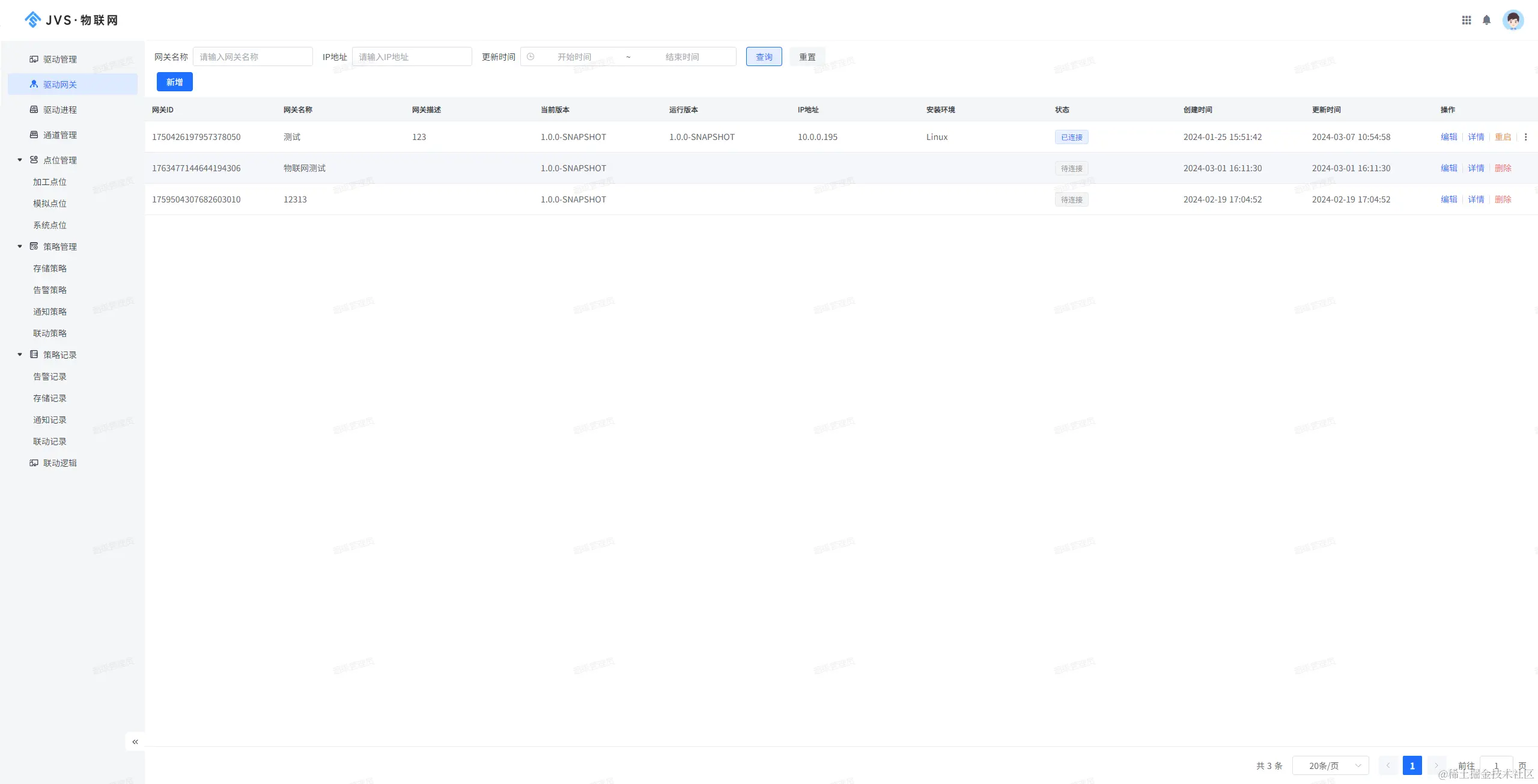 驱动网关的每行数据上 对网关操作的相关按钮,包括“编辑”、“详情”、“重启”、“日志”、“升级”、“删除”等操作。