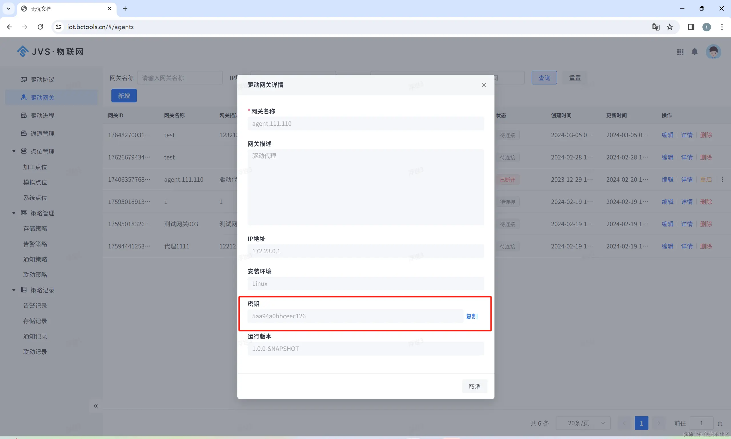 其中秘钥信息是比较重要的,秘钥是用于关联物理的 设备程序与我们配置信息。在边缘网关盒子(可安装的环境可以是边缘端或者云端)首次进行驱动网关程序的安装后(后续平台可以自动更新),需要把秘钥信息录入到网关程序中,当网关链接上网后,平台会自动发现网关自动上报的信息(动态发现),包括网关的IP地址、部署的环境(windows\linux\android)、运行版本信息。