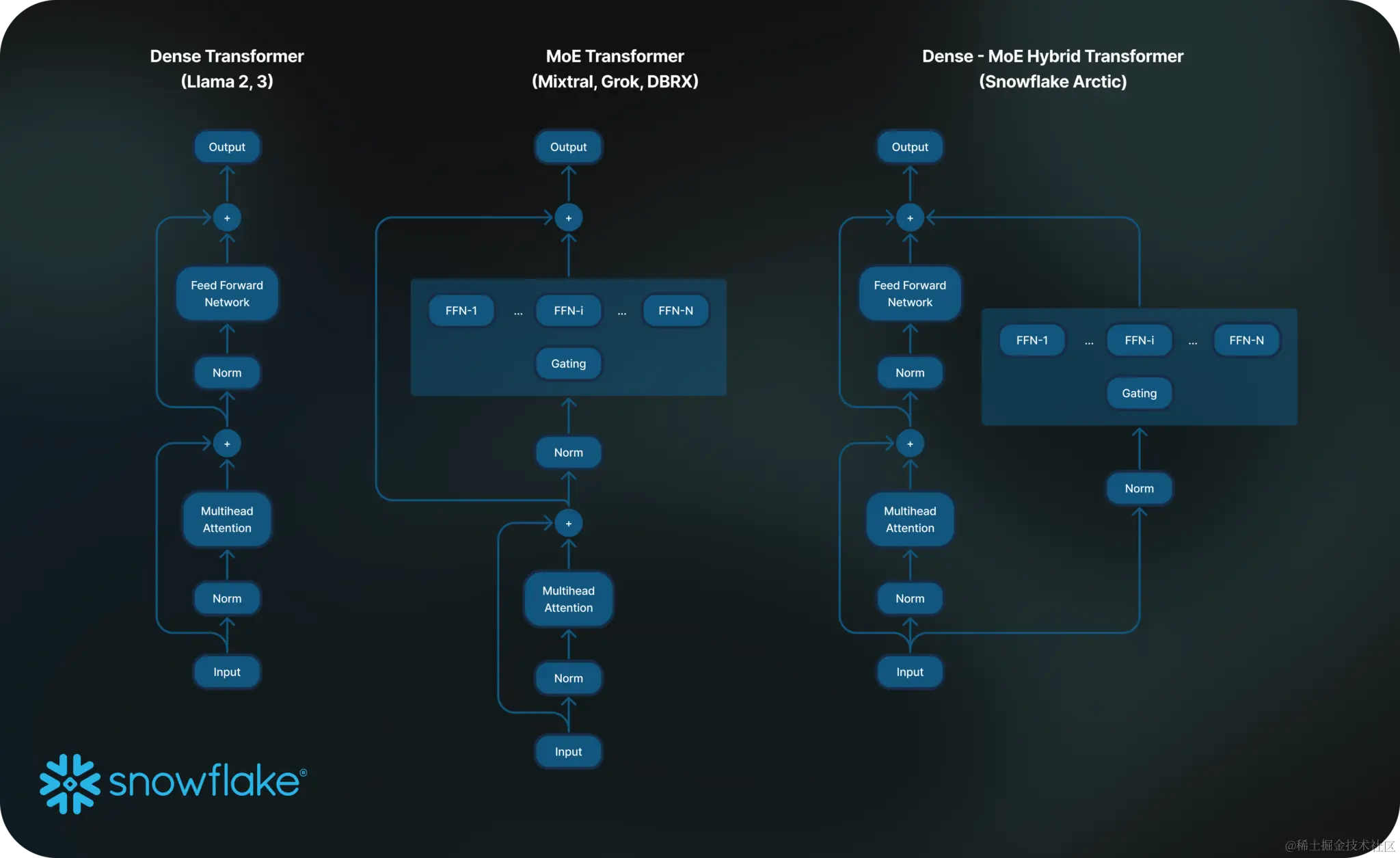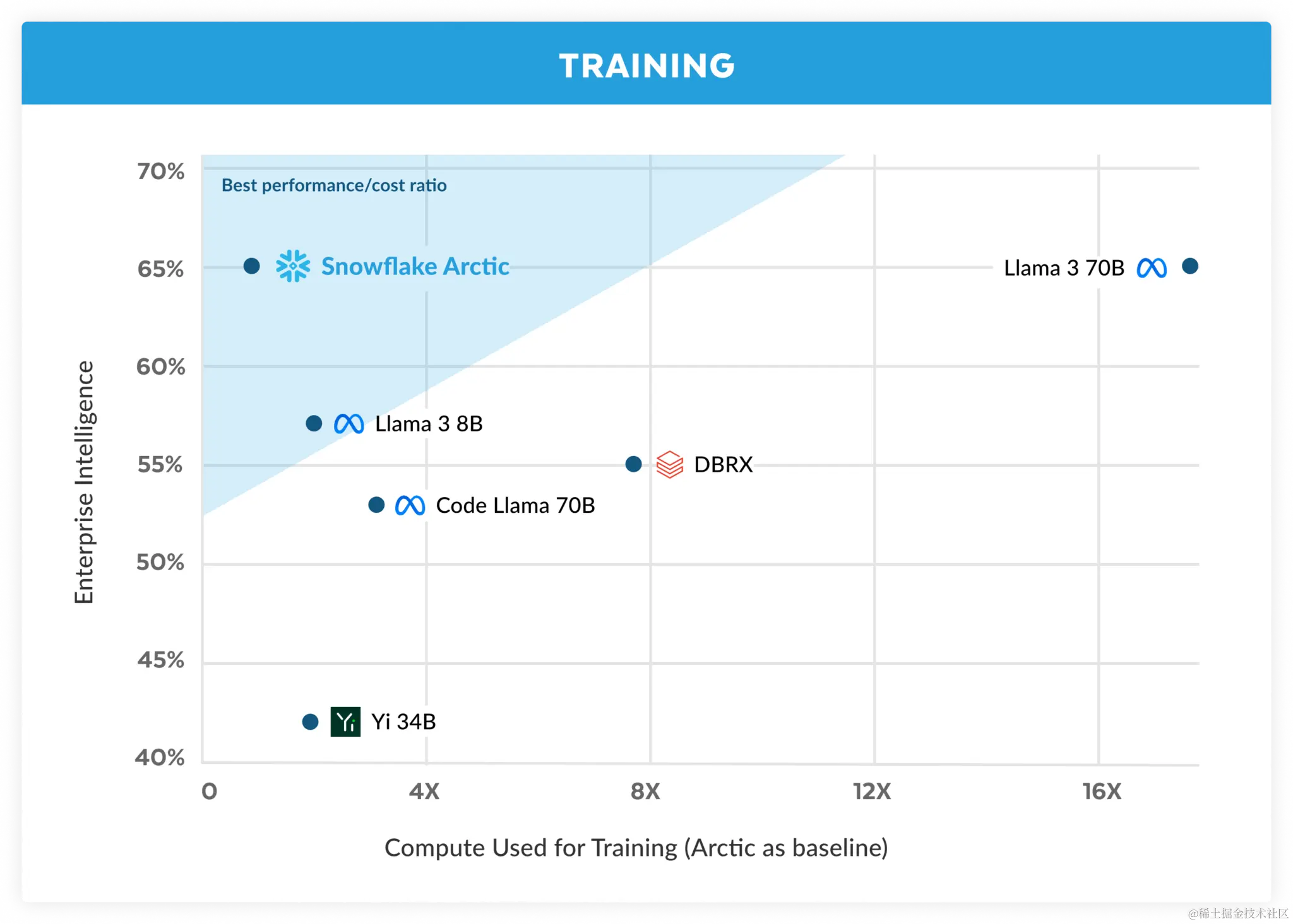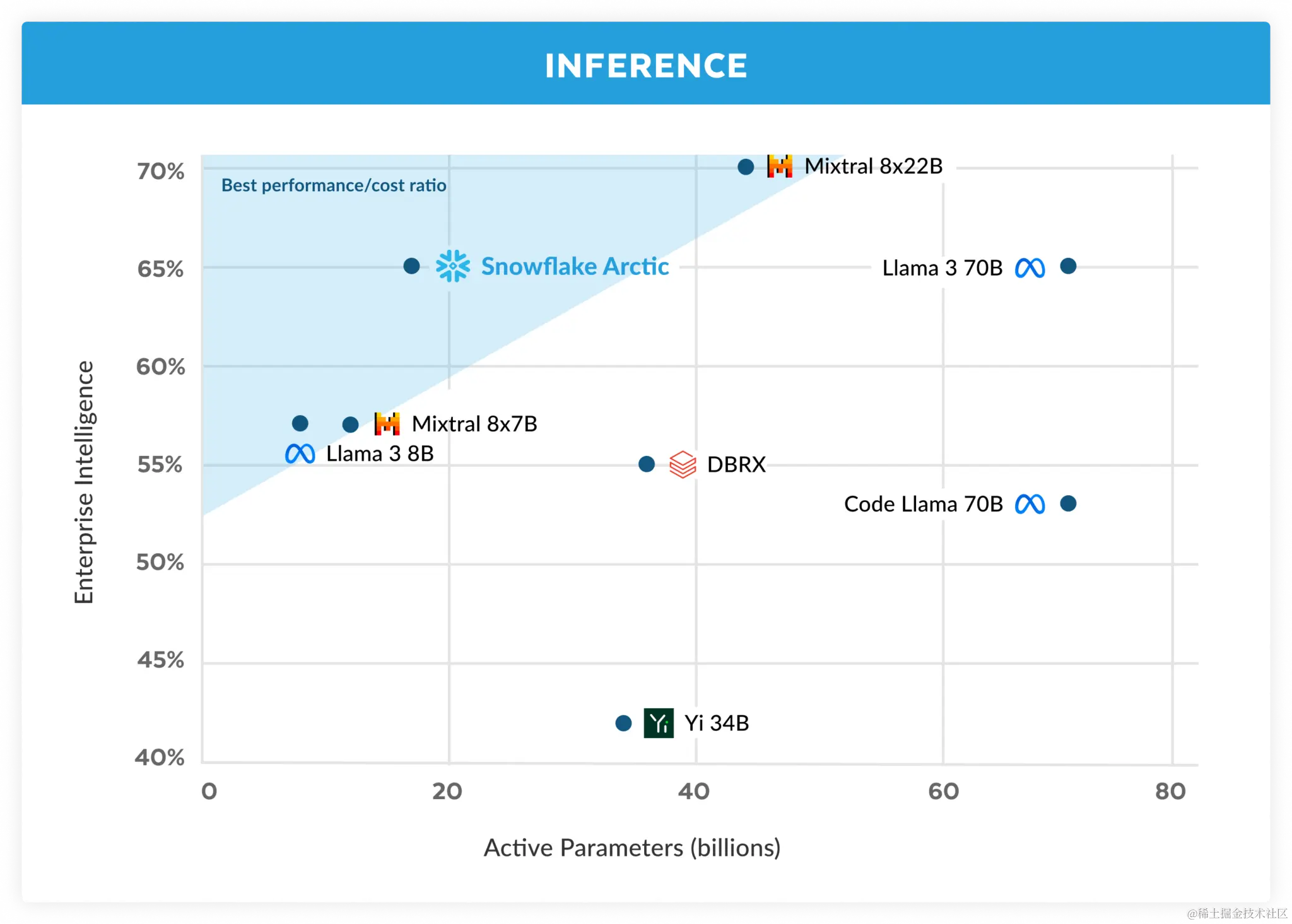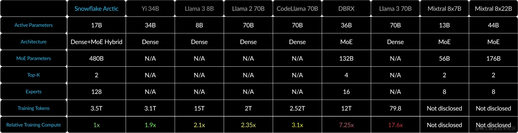 说回正题,自Grok-1发布后,开源界反响巨大——DBRX 和 C4AI Command R+ 相继发布,并宣布开源,希望填补企业空白。同时Datasets也增加了些许新的项目。就在24号,一向玩企业云计算和数据库的Snowflake,突然发布了一款仅为482B的开源企业级LLM——Snowflake Arctic。这是一款以企业为中心的顶级 LLM,它推动了具有成本效益的培训和开放性的前沿。Arctic是高效智能和真正开放的。