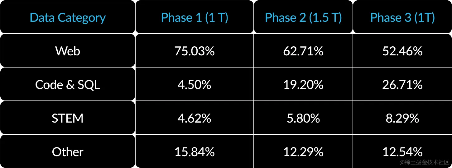 3)以企业为中心的数据课程:在代码生成和SQL等企业指标方面表现出色,需要的数据课程与通用指标的训练模型截然不同。在数百次小规模消融中,我们了解到,在开始时可以学习常识推理等通用技能,而编码、数学和 SQL 等更复杂的指标可以在培训的后期有效学习。人们可以类比人类的生活和教育,在人类生活和教育中,我们获得了从简单到困难的能力。因此,Arctic 接受了三阶段课程的培训,每个阶段都有不同的数据构成,第一阶段侧重于通用技能(1T tokens),后两个阶段侧重于以企业为中心的技能(1.5T 和 1T tokens)。这里显示了我们动态课程的高级摘要。