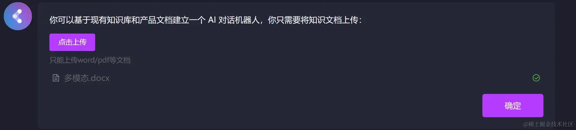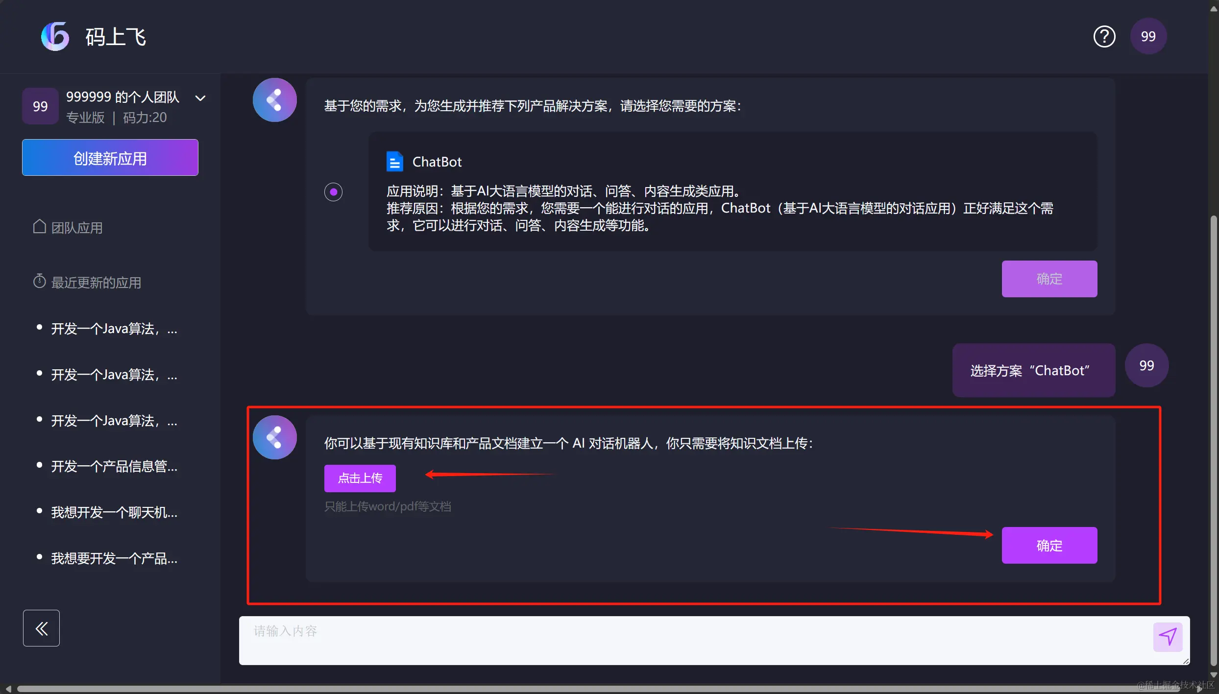 随后,我们只需要“点击上传文档” ,就可以直接开发出一个可以对话的聊天机器人