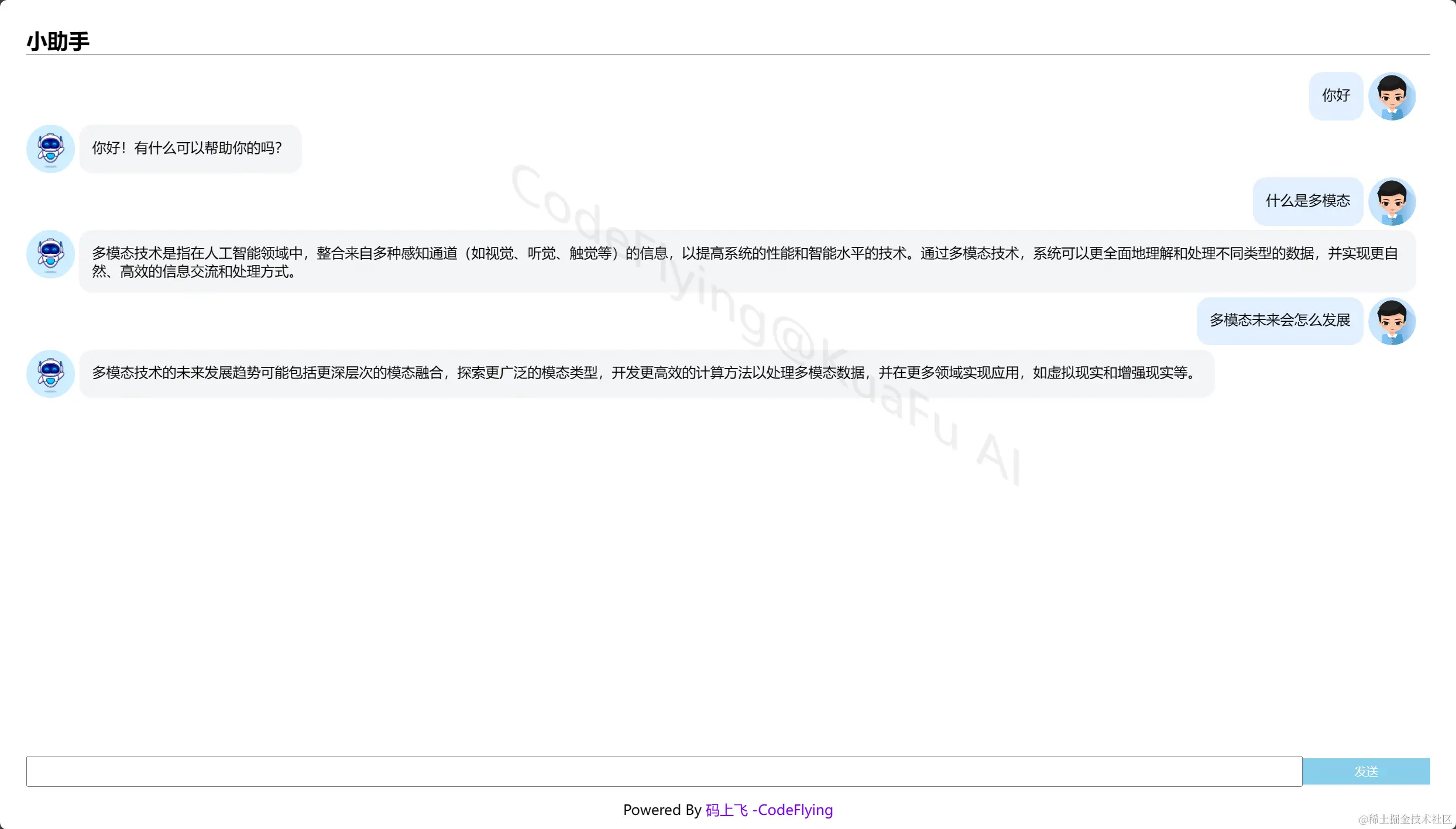 这个小助手就是AI帮我们开发的机器人,在右侧就可以直接和他进行对话了