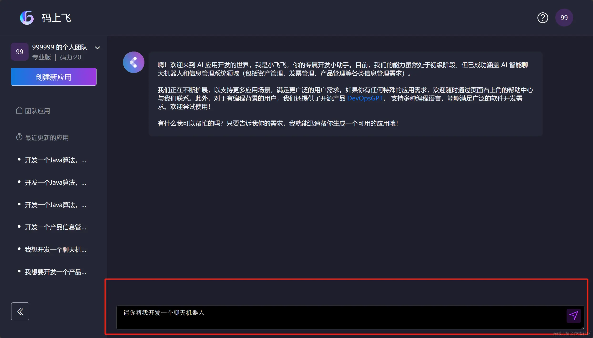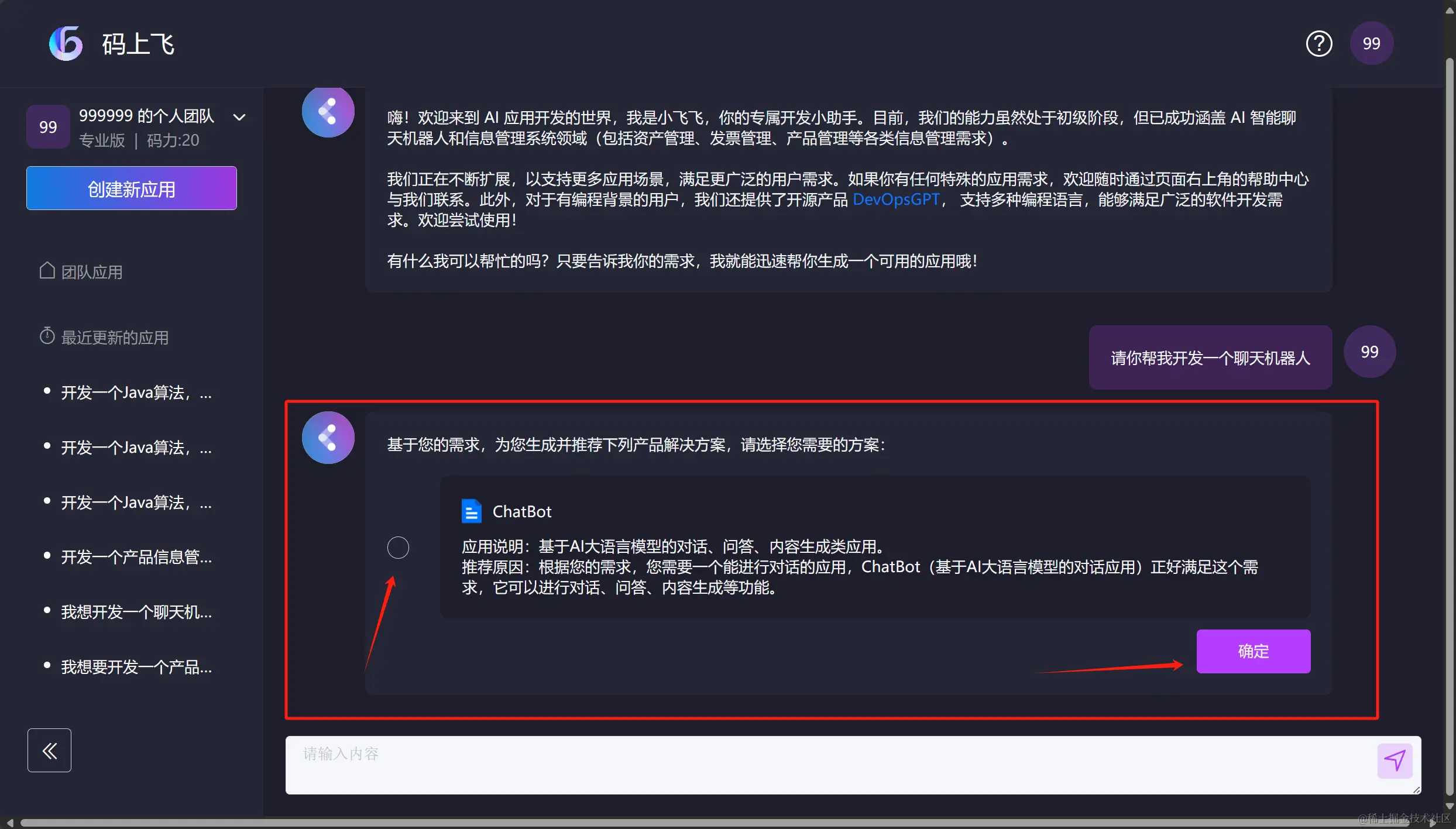 在 “聊天框内” 输入我们的需求 “请你帮我开发一个聊天机器人” ,并发送