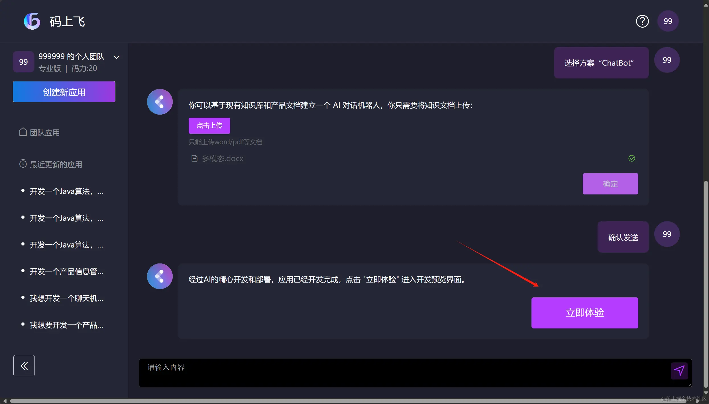 此时,AI已经帮我们完成了聊天机器人的开发,我们只需要点击 “立即体验” 就可以去使用它了!