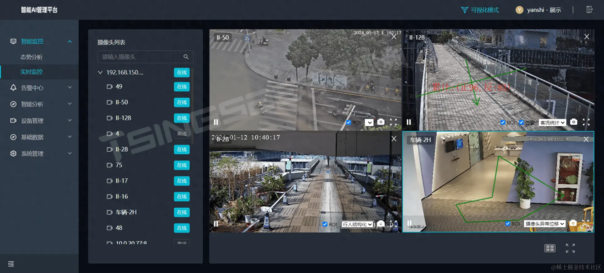 TSINGSEE青犀AI智能分析网关V4还支持人脸识别、车辆智能识别与管控、高空抛物、周界入侵防范、小区卫生环境等智能识别和预警。通过人工智能算法,实现对异常事件的自动识别和预警,加强对小区安全的防范,实现小区智能化监管能力,提高监管效率。感兴趣的用户可以联络我们。