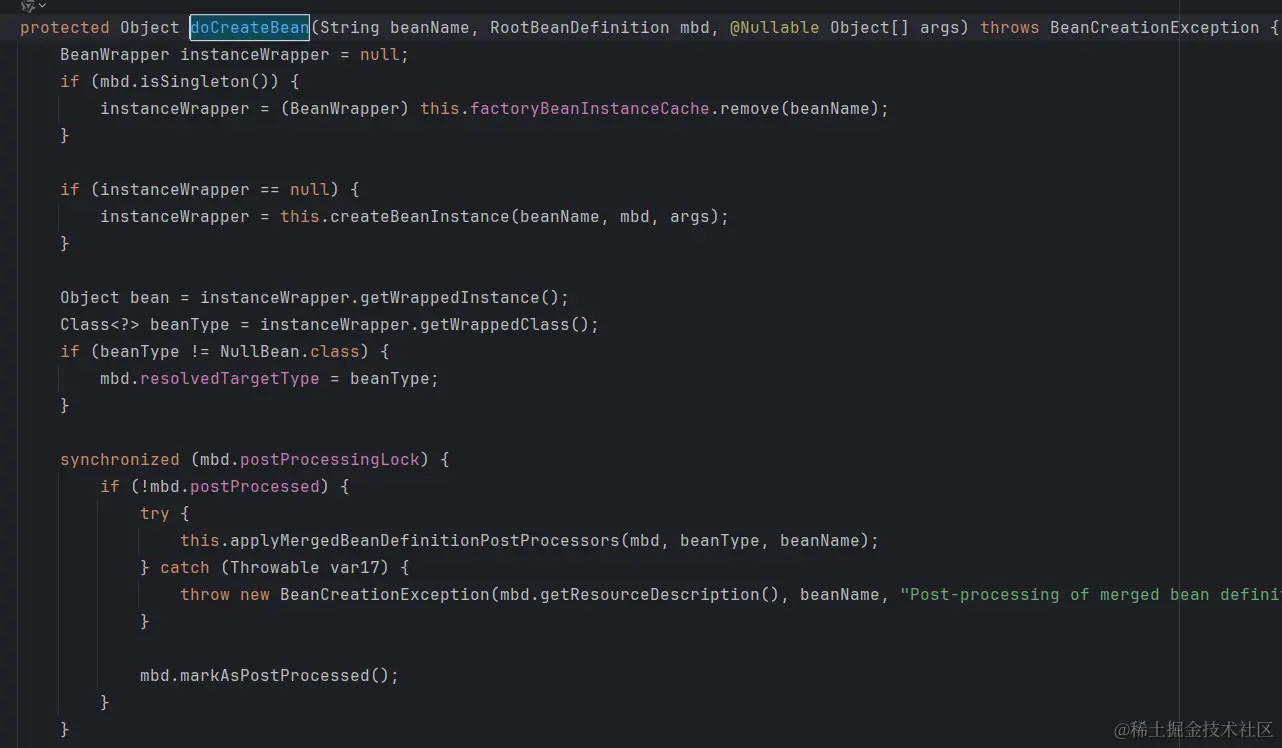 createBean方法是创建bean的核心逻辑,包括了bean的实例化、属性注入、循环依赖处理、初始化方法回调等。