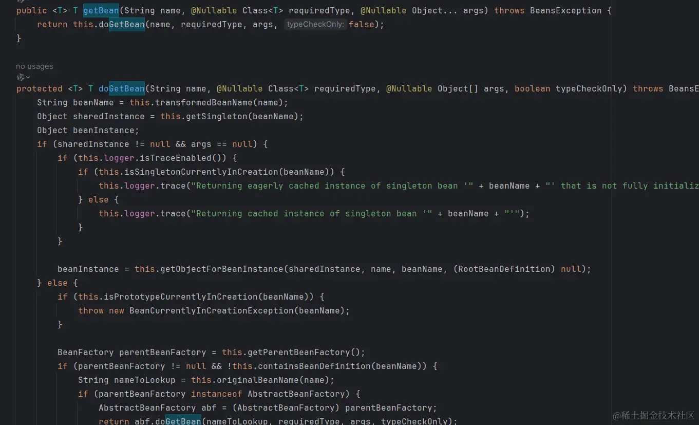 当我们需要使用某个bean时,就会调用AbstractBeanFactory的getBean(),它是获取bean的入口。