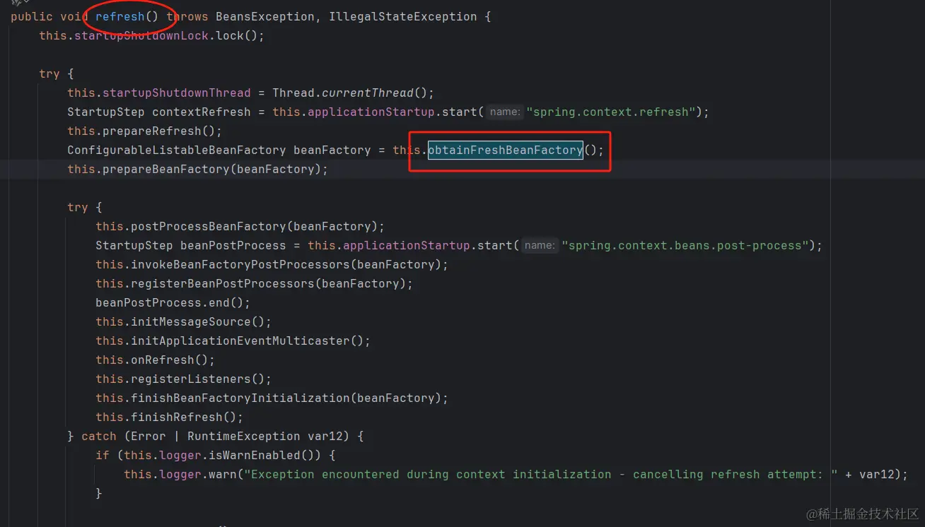 这里最关键的步骤是obtainFreshBeanFactory(),它会创建一个新的DefaultListableBeanFactory,这个Factory在后续会完成具体的bean加载和创建工作。