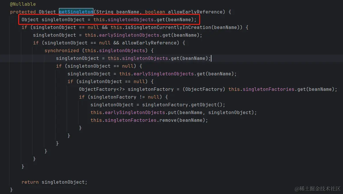 Object singletonObject = this.singletonObjects.get(beanName);