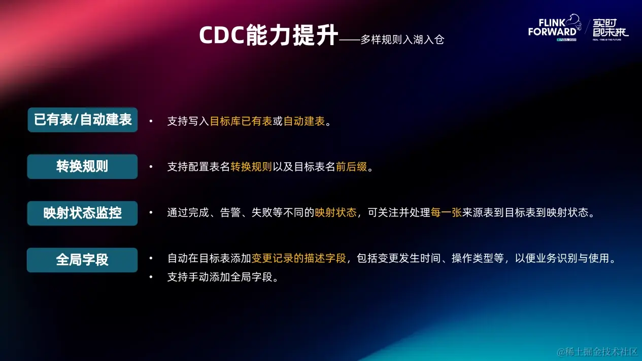 同时针对 CDC 数据发往下游入湖入仓的场景,提供一些可配的规则。