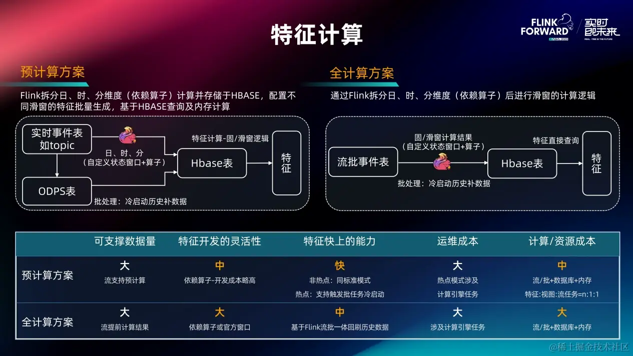 一个是特征开发的灵活性,对预计算方案来说,依赖自研的状态算子按照天、时、分来做预计算,开发成本高。对于全计算方案来说,除了可依赖自研算子外还能用官方的滑动或固定窗口进行计算,灵活性更高一点。