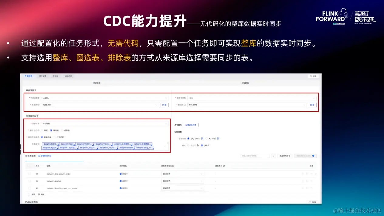 刚才介绍的所有的 CDC 能力的提升,平台侧都可通过配置化的任务形式,无需代码,只需配置一个任务即可实现整库的数据实时同步。