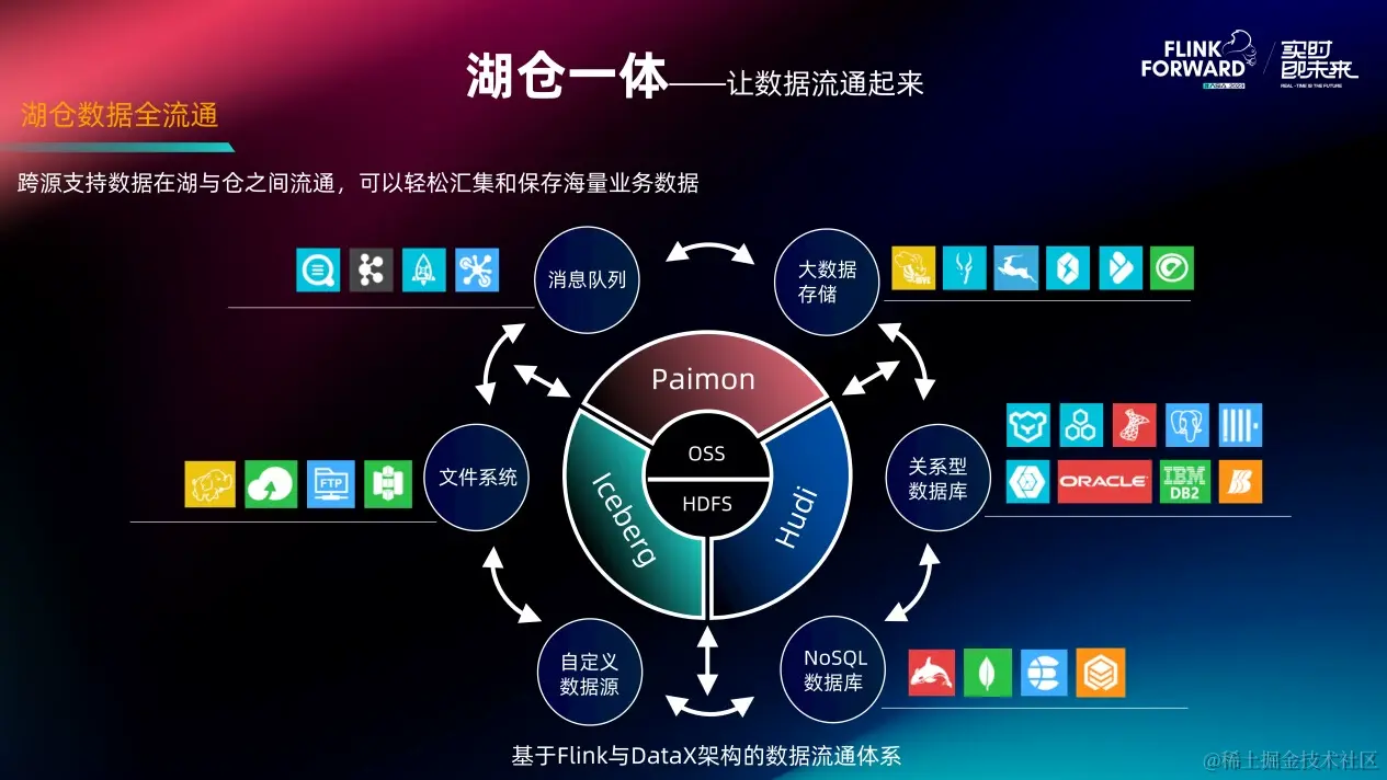 目前的湖仓架构,基于 OSS 或 HDFS 的文件系统,有三种数据湖 Paimon、Iceberg、Hudi 的可供选择。