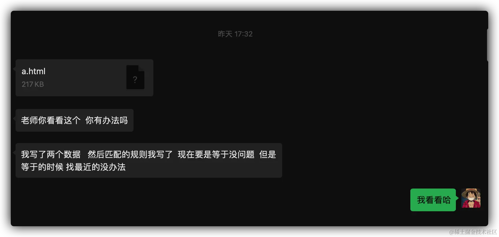 然后我们先是文字沟通,然后语音沟通,慢慢解释,磨蹭了半个小时,我才明白什么意思。然后花了 5 分钟解决了这个算法问题