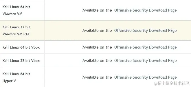 VMware、VirtualBox 和 Hyper-V 的镜像也可以从 Offensive Security 下载页面www.offensive-security.com/kali-linux-vm-vmware-virtualbox-hyperv-image-download/下载,如下面的截图所示: