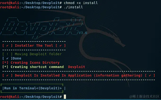 通过输入chmod +x install为文件授予可执行权限以安装,然后通过输入./install启动 Devploit。