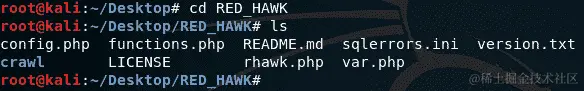一旦所有对象成功解压缩,通过输入cd RED_HAWK更改目录到RED_HAWK目录。使用ls命令验证rhawk.php是否存在:
